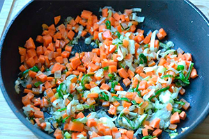 Додайте в сковороду моркву, коли вона стане м’якою, додайте до неї нарізану грудинку.