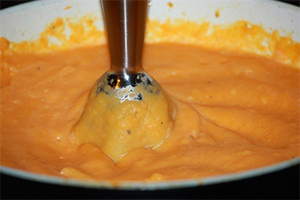 З овочів приберіть розмарин і подрібніть їх блендером. Перекладіть вийшло пюре в каструлю і, перемішуючи його віночком, потроху влийте бульйон і посоліть. Доведіть масу до кипіння і зніміть з плити.