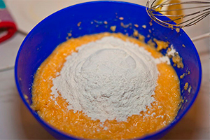 Додайте борошно і розпушувач, добре перемішайте і викладіть тісто у форму.