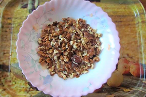 Поки запікається гарбуз з медом в духовці, займіться волоськими горіхами. Помістіть ядра в чашу блендера і подрібніть, також це можна зробити за допомогою кавомолки. При бажанні перш, ніж подрібнювати горіхи можете їх трохи підсмажити.