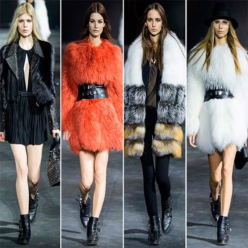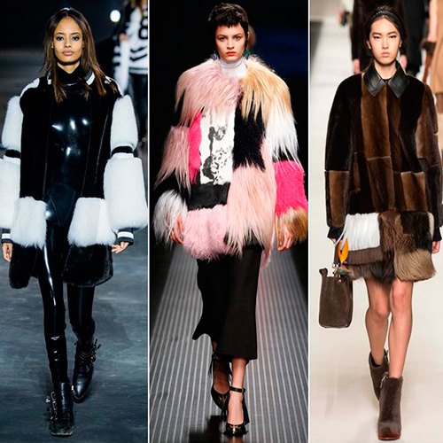 Щоб наряд був не лише актуальним, але і вражаючим, зверніть увагу на смугасті шуби. Зшиті між собою паралельні смужки хутра різних відтінків створюють певний градієнт, і багатобарвна шубка рясніє соковитими фарбами, що гармоніюють між собою. Врахуйте, що, одягаючись в настільки екстравагантну шубу, намагайтеся підбирати максимально лаконічні і скромні однотонні речі, взуття та аксесуари. У різнобарвних шубах вітаються не тільки рівні смужки, але і інші варіанти, наприклад, клапті (техніка печворк) або абстрактні елементи, дивимося такі шубки у Saint Laurent, Gucci, Emilio Pucci.