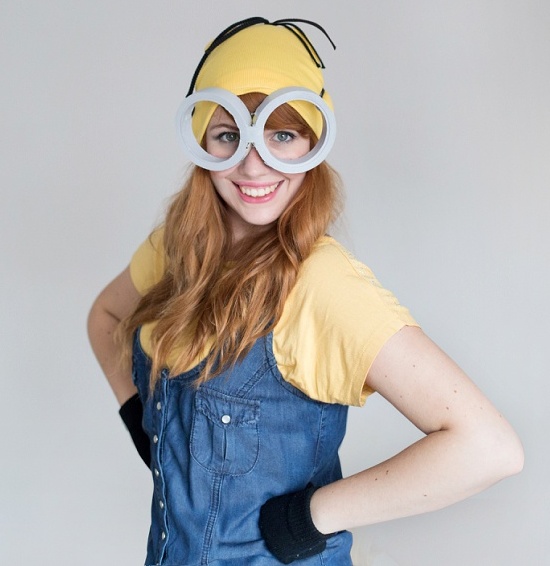 Складові частини образу міньйона готові. Тепер необхідно зібрати костюм: додатково вам знадобляться джинсовий комбінезон, жовта футболка і чорні рукавички. Повсякденний одяг перетвориться в карнавальний костюм саме за рахунок саморобних очок і шапочки з пасмами, які додадуть йому характерні і впізнавані риси веселих героїв. І, звичайно, не забудьте про банани – улюблені ласощі маленьких поплічників з культового мультфільму.