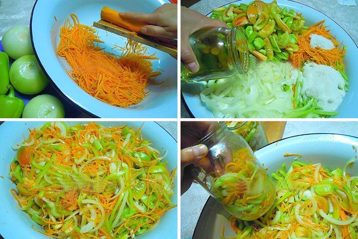 • Всі овочі перекладаємо в емальовану каструлю, додаємо олію, воду, сіль, цукор і настоюємо декілька годин.