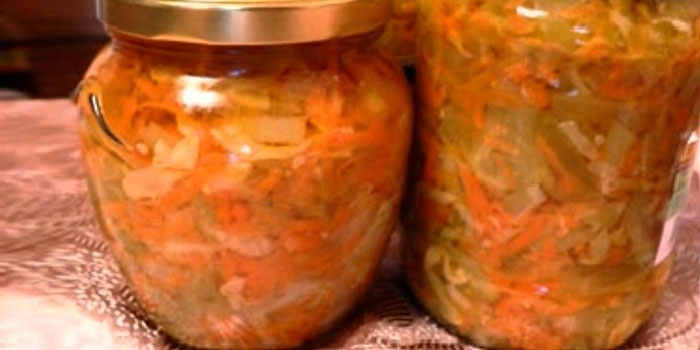 • Перемішуємо ретельно салат, розкладаємо по банках, стерилізуємо 15 хвилин. Закатуємо заготовки, перевертаємо, закутуємо. Коли консервація повністю охолоне, ставимо в льох.