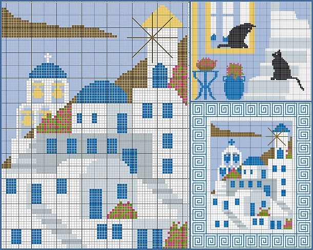 Якщо ви закохані в сонячну Грецію, то вам сподобається новітня розробка французької вишивальниці і автора багатьох схем Gazette. Це схеми вишивки Греції хрестом, так схожі на справжні пейзажі. Вони неймовірно ефектні і дуже прості, так що цілком годяться для початківців вишивальниць.