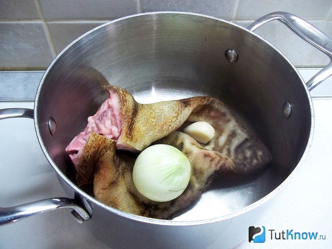 1. Свиняче вушко добре помийте. Слуховий прохід надріжте і видаліть всю грязь. Якщо буде потрібно, наскрібши вушко залізної мочалкою, щоб видалити обпалений наліт. Після цього вушко опустіть в каструлю, додайте очищену головку ріпчастої цибулі і зубчик часнику, залийте все водою і відправте варитися на плиту. Коли бульйон закипить, зніміть з його поверхні утворилася пінку, зменшіть вогонь до самого маленького, покладіть в каструлю лавровий лист, перець горошком і варіть вушко 2 години. За півгодини до готовності, приправити його сіллю і чорним перцем.