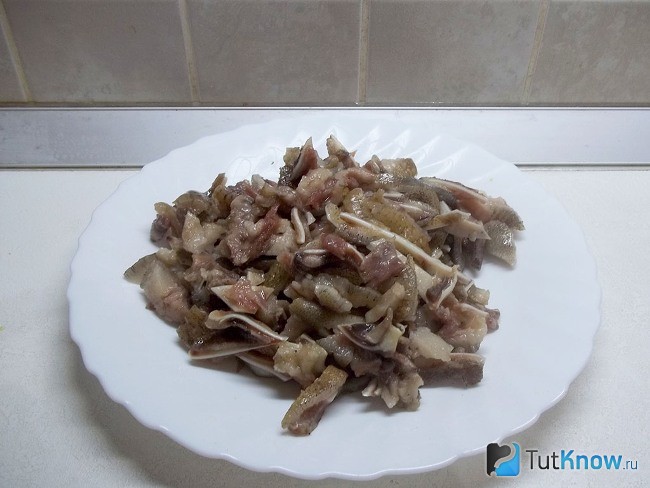 2. Коли свиняче вухо буде готове, повністю остудіть і наріжте соломкою. Звертаю увагу, що нарізати вушко слід саме охолоджене, оскільки в ньому багато клейковини, і якщо нарізати його гарячим, то шматочки між собою склеятся в один ком.