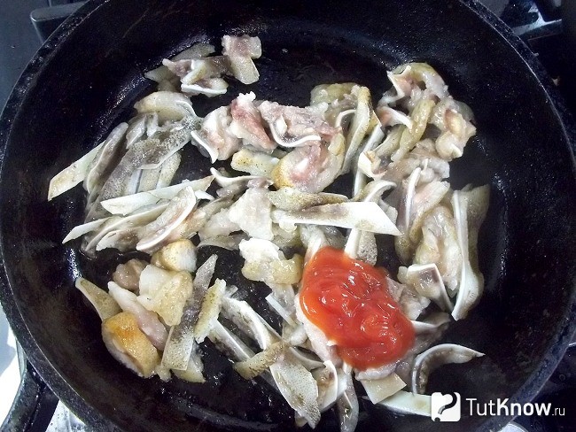 3. Сковороду поставте на плиту, налийте трохи олії і нагрійте його. Після цього відправте нарізані вушка смажитися. Покладіть до них кетчуп і сметану, добре перемішайте і протушкувати близько 10 хвилин. Готову страву можна подавати до столу як в гарячому вигляді до відвареної картоплі, так і в холодному вигляді — до келиху пива.