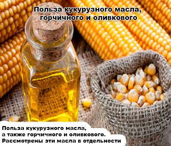Як бачите, користь кукурудзяного масла, а так само оливкової і гірчичного неоціненна. Розглянуті масла мають не тільки харчову цінність, але вони також представляють великий інтерес і як лікувальні засоби. Вони відповідають ідеальному поєднанню – смачно/корисно.