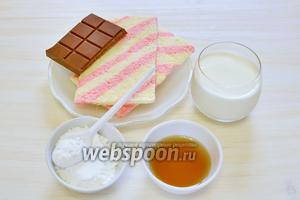 Приготуємо продукти і візьмемо 2 смужки бісквіта; вершки жирністю не менше 33%, цукрову пудру, ванільний цукор, сироп кленовий і шоколад темний, з якого зліпимо що-небудь для прикраси.