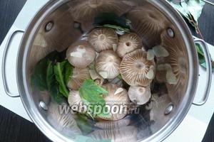 У каструлю (чи іншу ємність) викладаємо шарами гриби і зелень, пересипаючи сіллю і пластинками часнику.
