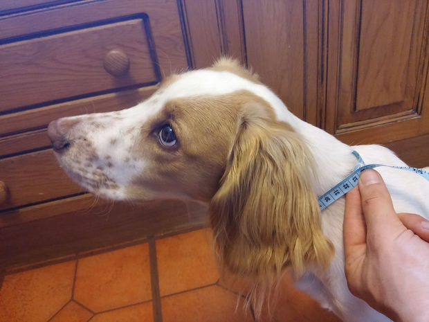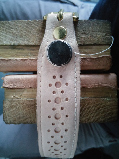 Приклад: якщо обхват шиї собаки становить 33 см, нашийник необхідно робити як мінімум такої довжини плюс застібка (щоб не здавлював горло пса), але ми зробимо ще плюс невеликий язичок з додатковими отворами, щоб довжину нашийника можна було регулювати, як у звичайних комерційних виробів, так що додайте до довжині ще 4 сантиметри мінімум. Разом тут: 37 см – довжина нашийника або 74 см – довжина заготівлі шкіряної під нашийник, який складається, як написано вище, з двох шарів козлячої шкіри.