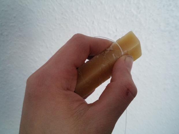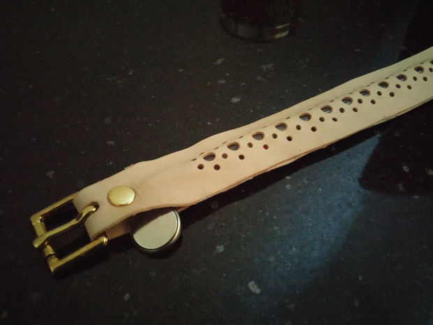 9. Міцну лляну нитку по всій довжині обробляємо будь воском, що є під рукою – це сильно полегшить шиття. Запасаємося терпінням і прошиваємо нашийник з намітці з обох сторін, допомагаючи собі металевим наперстком. При цьому не забуваємо після кнопки і перед початком швів по краях залишити достатню непрошитую область, щоб потім мати можливість міняти батарейку, але недостатню, щоб батарейка сама вивалювалася, коли нашийник буде висіти на бігає і стрибаючою собаці.