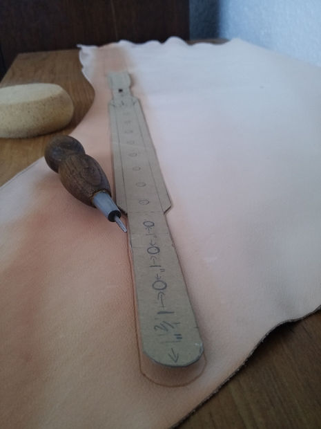 2. Чистою губкою трохи змочуємо розкладений на дошці шматок шкіри, кладемо зверху шаблон з картону так, щоб вся його довжина і ширина вмістилася на цілісному шматку шкіри/щільної тканини і малим ножем робимо на шкірі розмітку, обводячи шаблон. Або переверніть шматок шкіри навиворіт і зробіть спочатку намітку за шаблоном ручкою.