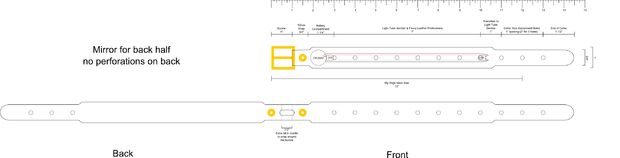 1. Для нашийника вимірюємо шию свого вихованця. Для шлейки – шию, обхват тулуба за передніми лапами, а також обхват лап зверху, до останнього додаємо як мінімум по 4-5 см, щоб собаці потім було зручно бігати і при цьому нічого ніде не натирало. З тонкого картону робимо за отриманими розмірами шаблон двошарового нашийника або шлейки відразу разом з дизайном (декоративні отвори зверху, через які буде видно світну вставку в нашийник/шлейку). Шаблон повинен складатися з двох з’єднаних частин, кожна з яких є дзеркальним відображенням іншої: 1 частина – верх нашийника з отворами, друга – низ нашийника без отворів (низ і верх – 2 шари одного нашийника), а між ними і встане трубка або гірлянда.
