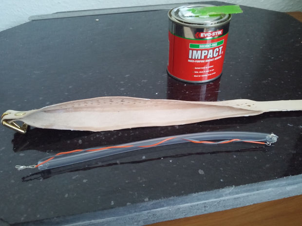 Спочатку склеюємо 1 край, за необхідності стискаємо його до повного висихання клею. Потім вкладаємо всередину світиться трубку з батарейкою і склеюємо другий довгий край нашийника і також стискаємо його до повного висихання клею. Тепер поки знову виймаємо батарейку і трубку.
