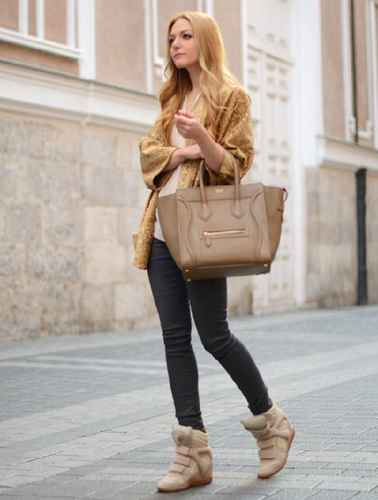 - Утеплені кеди на танкетці найкраще носити з курткою або плащем, пошитыми в агресивному стилі «мілітарі». Таке взуття підійде до верхнього одягу casual-стилю.