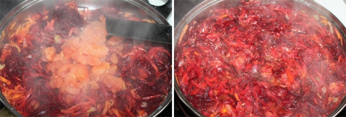 - Для заправки подрібнюємо на дрібні квадратики цибулю, часник на тертці трьом буряк. Всі висипаємо в сковорідку з гарячим оливковою або соняшниковою олією. Протушив блюдо 2-3 хвилини, закладаємо ще на пару хвилин томатну пасту. Щоб заправка не підгоріла, ретельно її помішуємо. Готову заправку перекладаємо в бульйон. Варимо 5-7 хвилин.