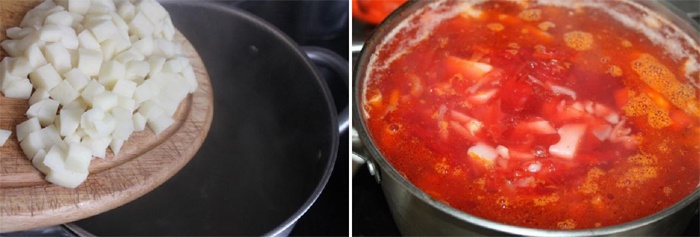- У цей час у каструлю з водою опускаємо нарізаний квадратиками картоплю, доводимо до кипіння, зменшуємо вогонь, варимо до готовності.