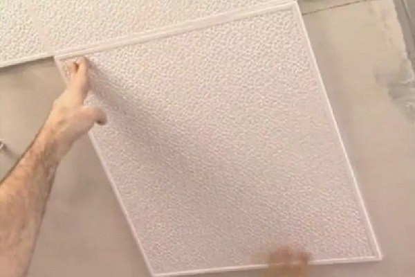 Саму першу плитку наклеюють рівно по центру, по намічених лініях. Потрібно прикласти плитку, промазану клеєм, до стелі і потримати так кілька секунд. Всі такі плити слід укладати поруч, щільно, без проміжків і відступів.