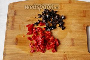 Далі дрібно наріжемо помідори і оливки.