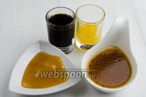 Щоб приготувати соус, потрібно злити залишився після запікання сік (100 мл процідити), підготувати мед, соєвий соус, сік апельсина, коричневий цукор і сіль.