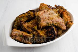 Готові реберця вийняти з духовки. Викласти на блюдо. Злити сік, що залишився.