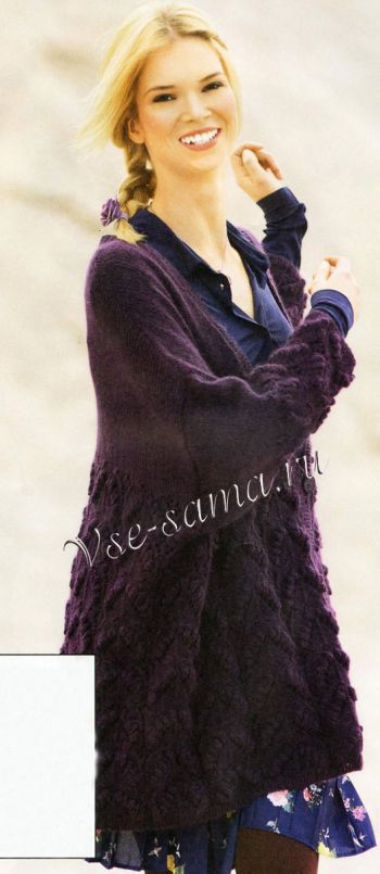 Виконати плечові шви. Для планки набрати на спиці по бортах поличок з 90 петель, по краях скосів горловини поличок з 73 петлі і по краю горловини спинки 39 петель і на всіх 365 петлях в’язати візерунком 1, при цьому в 4-му ряду на правій поличці виконати 4 отвори для гудзиків наступним чином: закрити 3 п. і в наступному ряду знову набрати. Перше отвір для гудзики виконати через 6 петель від нижнього краю, решта 3 отвори – з інтервалом 22 п. Через 8 рядів від початку планки закрити петлі. Виконати шви рукавів і вшити рукава. Пришити гудзики.