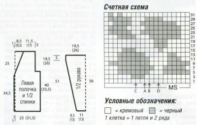 Набрати на спиці № 5 кремовою ниткою 40 (50) петель і в’язати візерунком 2, при цьому для 2-го розміру закінчити петлями до стрілки А і 1 кромочной. Через 34,5 см = 64 ряду від початкового ряду закрити для скосу горловини по лівому краю 1 х 1 л., потім у кожному 2-му ряду 4 х 1 п. і в кожному 4-му ряду 9 х 1 п. (в кожному 2-му ряду 8 х 1 п. і в кожному 4-му ряду 7×1 п.). Одночасно виконати пройму по правому краю, як на спинці. На висоті спинки закрити залишилися 18 (26) петель плеча.