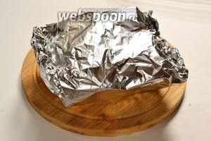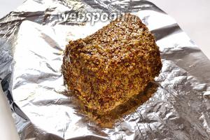 Загортаємо м’ясо у фольгу, але фольгу щільно до м’яса не притискаємо. Запікаємо спочатку 30 хвилин при 240°С, а потім ще 50 хвилин при 220°С. Готовність м’яса можна перевірити, зробивши надріз. Всередині не повинно бути крові, тільки прозорий сік.