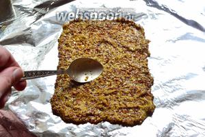 На шматок харчової фольги покласти шар зернової гірчиці. Рівномірно розподілити його за допомогою ложки. Цей шар повинен бути розміром приблизно з наш шматок м’яса. Товщину шару можете регулювати самі під себе. Я роблю товщину близько 3 мм.