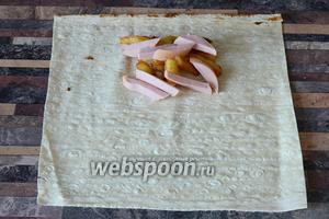 Розстилаємо лаваш на рівній поверхні, потім кладемо ковбасу і картоплю.