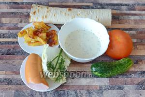 Для приготування шаурми з ковбасою вам знадобиться ковбаса варена, пекінська капуста, огірок, помідор, картопля смажена, лаваш і часниковий соус.