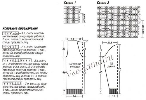 Наберіть на спиці темно-зеленої пряжею 56 п. і в’яжіть 20 рядів гумкою поперемінно 6 рядів темно-зеленої пряжею і 4 ряди білої. Далі в’яжіть темно-зеленої пряжею, додавши в 1-му ряду рівномірно 2 п., наступним чином: кром., 1 п. осіб. гладдю, 8 п. платочної в’язкою, 1 п. осіб. гладдю, 3 п. ізн. гладдю, 6 п. візерунком за схемою 1, 4 п. ізн. гладдю, 1 п. осіб. гладдю, 8 п. платочної в’язкою, 1 п. осіб. гладдю, 4 п. ізн. гладдю, 6 п. візерунком за схемою 1, 3 п. ізн. гладдю, 1 п. осіб. гладдю. 8 п. платочної в’язкою, 1 п. осіб. гладдю, кром., додаючи для скосів рукава з обох сторін у кожному 6-му рядку 19 разів по 1 п., потім у кожному 4-му ряду 3 рази по 1 п., додані петлі в’яжіть так: 4 п. ізн. гладдю, 1 п. осіб. гладдю, 8 п. платочної в’язкою, 1 п. осіб. гладдю. 4 п. ізн. гладдю, 1 п. осіб. гладдю, 3 п. платочної в’язкою. Провязав 128 рядів від гумки, для оката рукава закрийте з обох сторін у кожному 2-му ряду 1 раз 8 п., 7 разів по 1 п., 5 разів по 2 п., 6 разів по 1 п., 5 разів по 2 п. Провязав 46 рядів від початку оката, закрийте залишилися петлі.