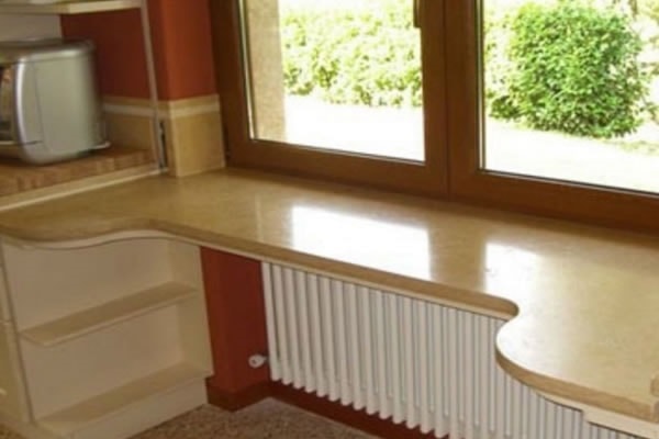 Довга, витягнута прямокутна стільниця – це рішення для маленької кухні, яке істотно заощадить вільний простір. Таку стільницю можна зручно розташувати уздовж вільної стіни, за типом барної стійки.