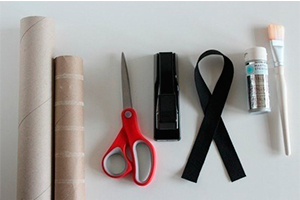Тепер з картонного циліндра виріжте два кола і пофарбувати їх сріблястою фарбою. Скріпіть кола степлером. Після цього відріжте гумку, потрібної довжини (вона буде служити держателем окулярів) і знову використовуючи степлер, прикріпіть її до окуляр. Щоб окуляри виглядали більш естетично, покрийте «оправи» сріблястою фарбою і зсередини.