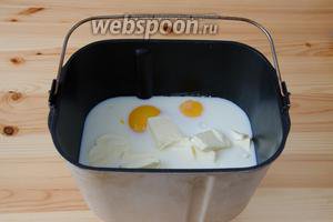 Додаємо 1 яйце і 2 жовтки. Решта білки нам не знадобляться. Туди ж додаємо вершкове масло і вливаємо молоко. Закриваємо кришку хлібопічки і включаємо програму основного замісу тіста (у мене вона займає 2 години 20 хвилин).