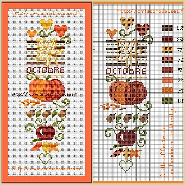 Якщо ви шукаєте симпатичний дизайн осінньої вишивки хрестом, то загляньте в блозі “Les brodeuses de Marilyn”. Там ви знайдете ще одну нову безкоштовну схему вишивки осені, для тих, хто небайдужий до золотим листям, пузатим жолудям, помаранчевим гарбузам – неодмінних атрибутів жовтня.