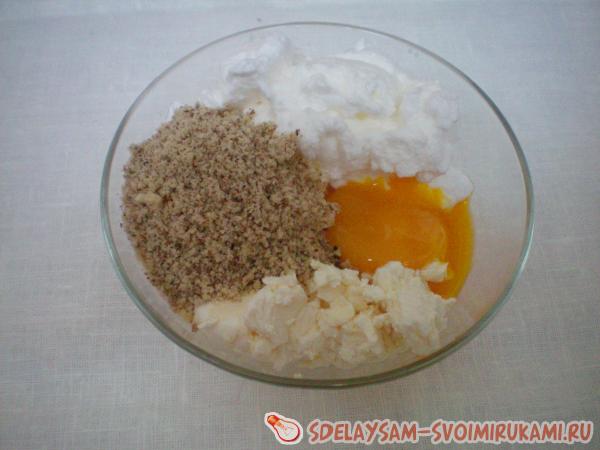 Білок одного яйця і одну столову ложку цукру збити до густої піни, додати сир, жовток і попередньо подрібнений мигдальний горіх. Начинку перемішати і викласти по чайній ложці на запечені яблука. Десерт знову відправляємо в духовку на 7-10 хвилин.