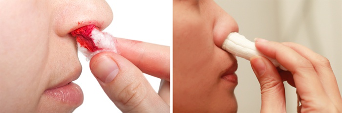 Якщо перелічені методи не допомогли, варто спробувати зупинити кровотечу за допомогою тампона, змоченого в 3% перекису водню або яким-небудь судинозвужувальну препаратом («Галазолином», «Санорином»). Вату слід ввести в носовий прохід і залишити там до припинення эпистаксиса. Врахуйте, що категорично заборонено при носовій кровотечі закидати голову назад або лягати на спину, оскільки є загроза, що людина захлинеться кров’ю, а вона, потрапивши у шлунок, здатна викликати блювоту.