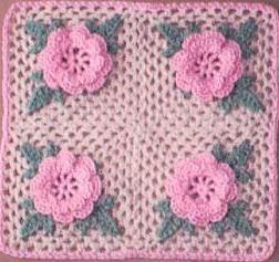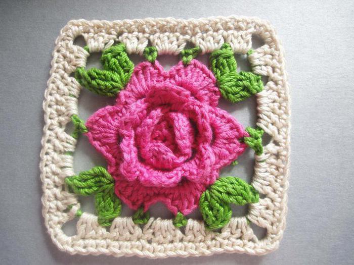 У квадратних мотиви в якості основи досить часто використовується в’язання гачком троянди. Схема роботи в них завжди приблизно однакова. Спочатку робиться готовий квітка, а потім до нього прив’язуються листочки і основний фон, який перетворюється в квадрат.