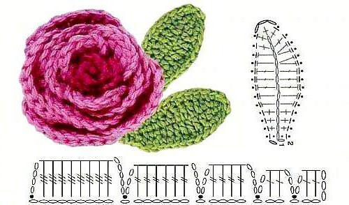 Листочки у цій схемі робляться окремо, а потім пришиваються. Приклад листа може бути наступним: в’яжемо ланцюжок з повітряних петель і формуємо з нього 3 петельки. Потім обв’язуємо їх стовпчиком без накиду таким чином, щоб захоплювати далекий край петельки і приховати утворилася дірочку.