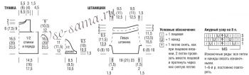 Праву і ліву штанини перенести на кругові спиці і набрати додатково між ними для крокового клина 2 х 7 п. = 122 (138) 154 п. Продовжити в’язати круговими рядами лицьовій гладдю, при цьому виконати убавки додатково набраних крокових петель наступним чином: петлю перед 1-ї крокової петлею зняти, 1-ю крокову петлі провязать лицьовій і протягнути через неї зняту петлю, останню крокову петлю пров’язати з наступної петлі разом лицьовою. Ці убавки повторити в кожному 2-му коло.р. ще 2 рази. Потім у наступному 2-му коло.р. пров’язати останню крокову петлю з наступної петлі разом лицьовою, щоб всі крокові петлі були убавлены. Потім для бічних скосів зменшити по обидва боки в кожному 8 (10) 12-му коло.р. 3 х 1 п. Через 9,5 (11,5) 13,5 см від початку кроку продовжити в’язати укороченими рядами.