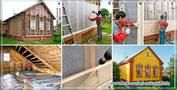 а) Бруси обрешітки сеченим 100 * 50 мм, необхідні для подальшого монтажу плівкового «чохла», ставлять на ребро б, в) Паронепроникну плівку кріплять за допомогою степлера і скоб г, е) Стіни обшивають дошкою, що імітує брус, щільно притиснувши облицювання до відливу над фундаментом д) Ековату для теплого «ковдри» горищного перекриття напилюють щільністю 35 кг/м3 товстим шаром. Це гарантує заповнення всіх порожнин конструкції