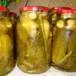 • Банки для маринування огірків необхідно попередньо простерилізувати. Найпростіший варіант – покласти в банку кришку від неї, залити окропом, вийняти обережно пінцетом кришку і закрити банку, залишивши її в такому вигляді на кілька хвилин. Потім воду можна злити. Після цього можна приступати до маринування огірків: на дно ємності кладуть зелень, часник, зерна гірчиці – на одну банку одну чайну ложку, огірки і перець – 3 столові ложки на банку.
