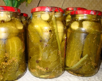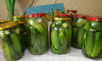 • Готові банки перевертаються денцем вниз і залишаються в такому вигляді до повного охолодження. Накривати їх зверху не рекомендується – так огірки залишаться твердими.