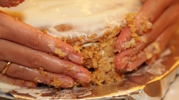 Готові коржі на деякий час відкладаються в сторону, а решта обрізки перетираються руками до стану великої крихти.