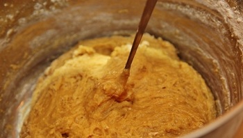 Невеликими порціями в отриману суміш вводиться борошно і розмішати ложкою – вручну таке тісто готувати трохи незручно, можна отримати опік, оскільки суміш ще гаряча.