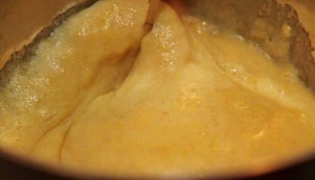 Суміш нагрівається до тих пір, поки об’єм не збільшиться і вона не стане схожою на піну, після чого каструлю знімають з вогню.