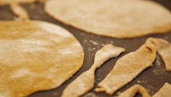 Залишилися після обрізання тіста шматочки викидати не варто – вони стануть в нагоді при подальшому приготуванні. Корисний рада: розкачувати таке швидко, потрібно дуже швидко, оскільки на відкритому повітрі воно за короткий проміжок часу втратить еластичність і твердість.